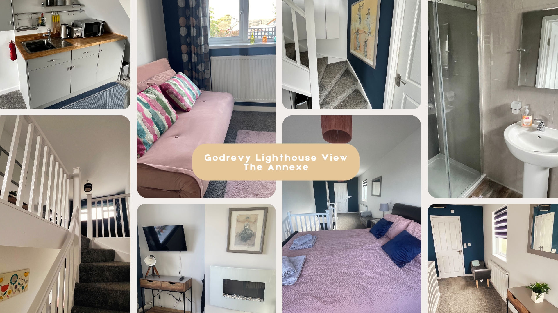 Godrevy Lighthouse View is the Annexe to Tremarclyn. It has 1 kingsized bedroom upstairs with beautiful sea views of the lighthouse at Godrevy. It has it's own private entrance, driveway and outdoor patio. The downstairs living area comes equipped with a kitchenette including microwave, two ring electric hob, fridge with small freezer compartment, kettle and toaster. There is also a table with four chairs and a double sofa-bed. The bedroom is open plan to the staircase (so make sure you are friendly with your fellow guests if you are sharing!). There is a modern ensuite bathroom with shower upstairs also.